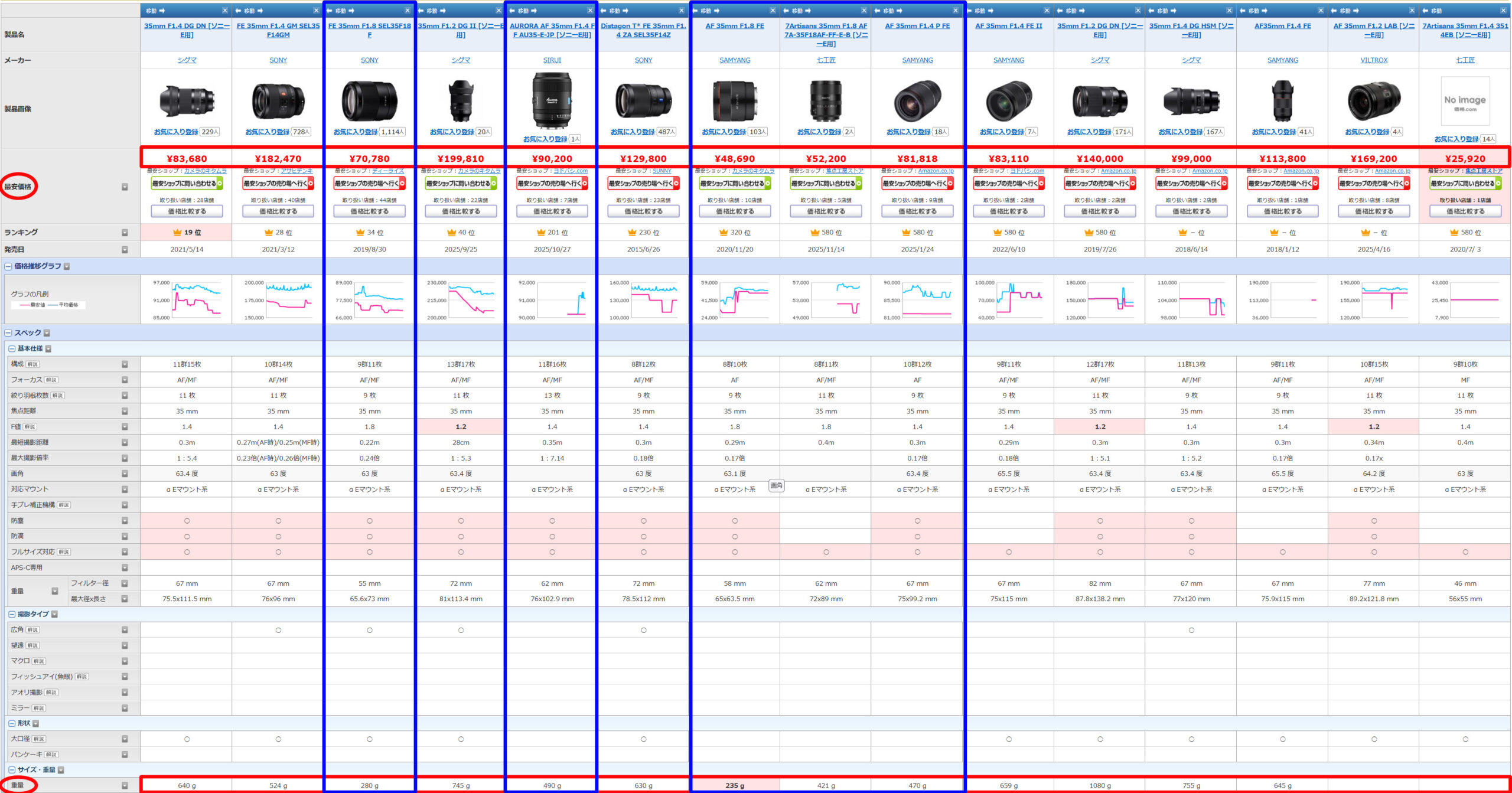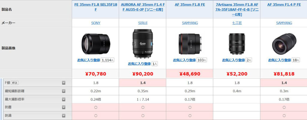 その為、重量500g以上は選択肢からは外すことで5種をピンクアップ。 SONY純正をベンチマークに同じF1.8ならサードパーティ製は、約2万円前後安価。 一方、F1.4とF値を一段上げると1~2万円アップという目安が得られました。