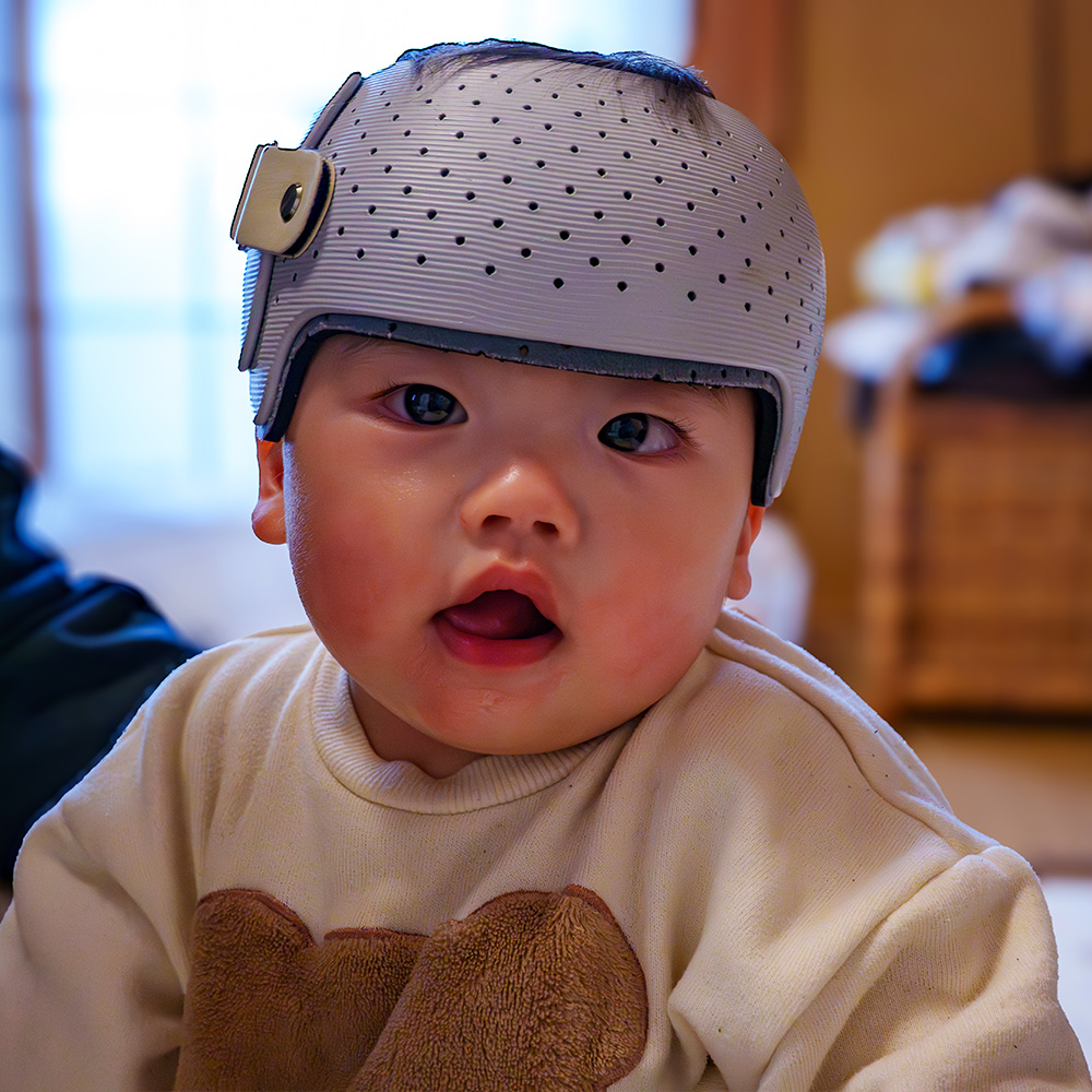 生後7カ月目になった孫です。 頭に付けているヘルメットは、形を整える為の矯正治具だそうです。 もう直ぐ外せるとのことですので、矯正が終了して外せれば、再度撮影したいと思います。 35mmの広角にも関わらず、それなりにボケ感が得られて気に入りました。